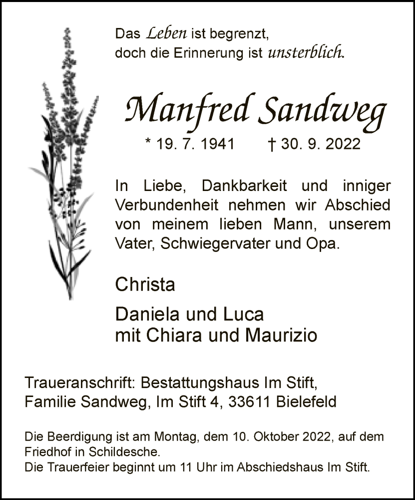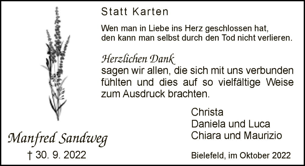 Hier finden Sie alle Traueranzeigen aus der Zeitung, die bisher für Manfred Sandweg erschienen sind. Weitere Traueranzeigen, die in der Zeitung erscheinen, werden hier ebenfalls aufgelistet