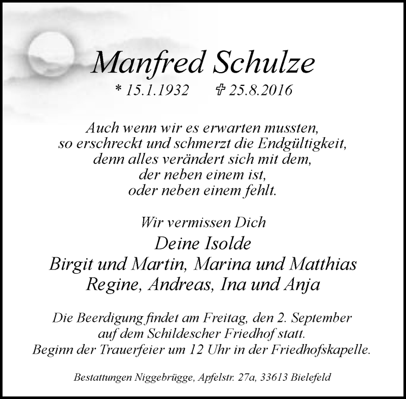 Hier finden Sie alle Traueranzeigen aus der Zeitung, die bisher für Manfred Schulze erschienen sind. Weitere Traueranzeigen, die in der Zeitung erscheinen, werden hier ebenfalls aufgelistet