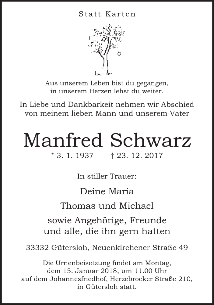 Hier finden Sie alle Traueranzeigen aus der Zeitung, die bisher für Manfred Schwarz erschienen sind. Weitere Traueranzeigen, die in der Zeitung erscheinen, werden hier ebenfalls aufgelistet