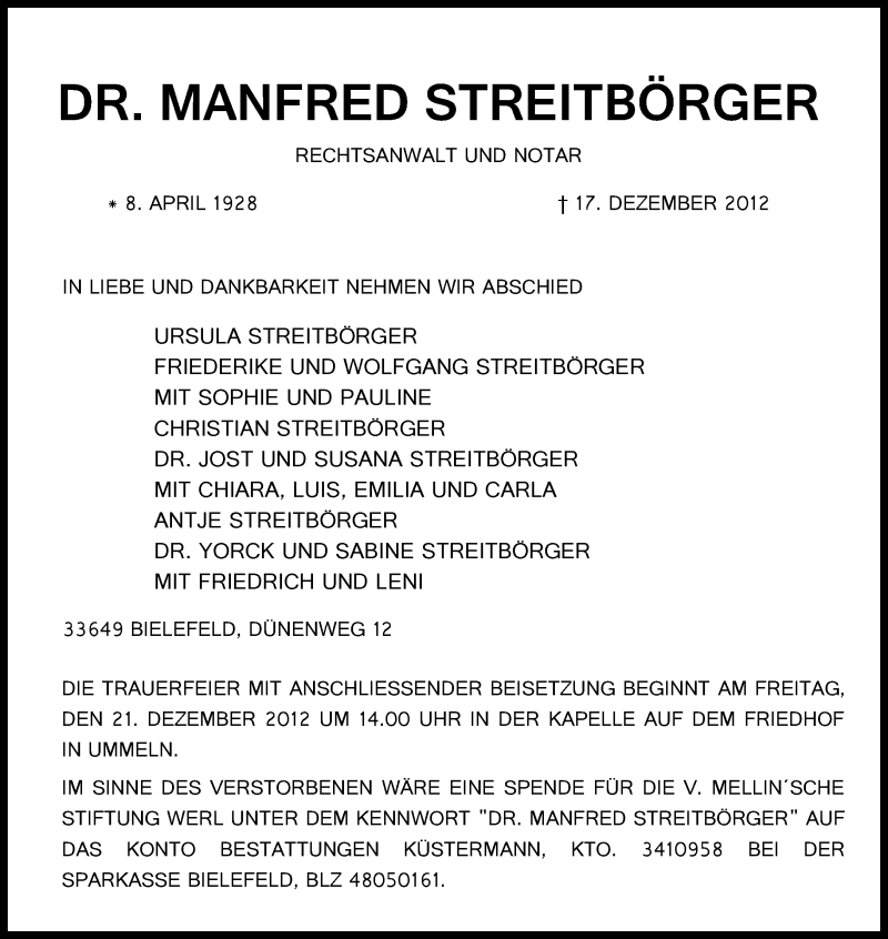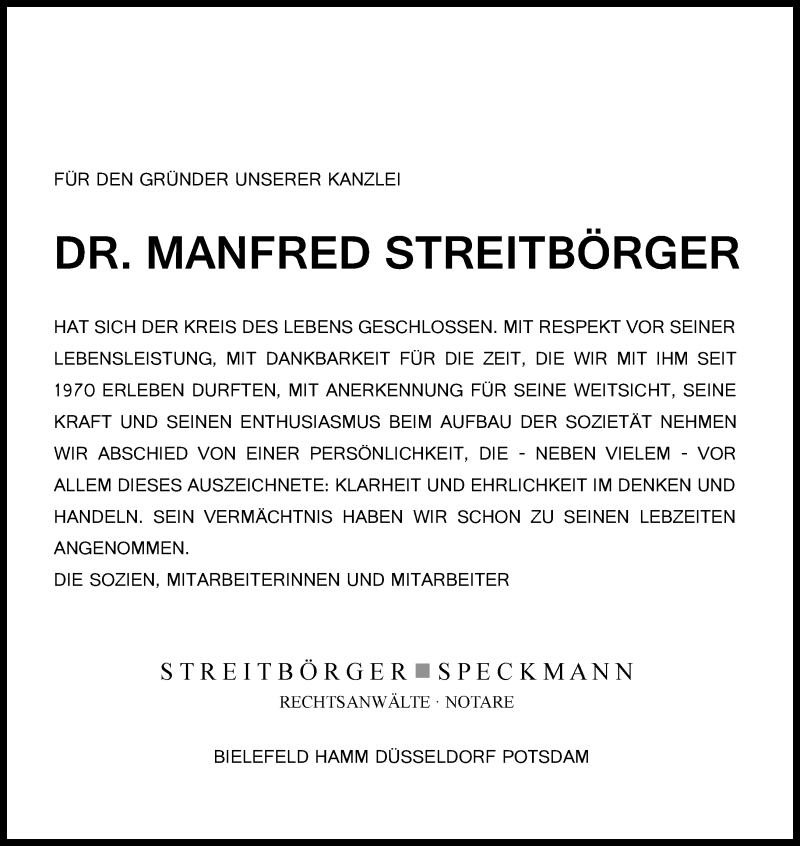 Hier finden Sie alle Traueranzeigen aus der Zeitung, die bisher für Manfred Streitbörger erschienen sind. Weitere Traueranzeigen, die in der Zeitung erscheinen, werden hier ebenfalls aufgelistet