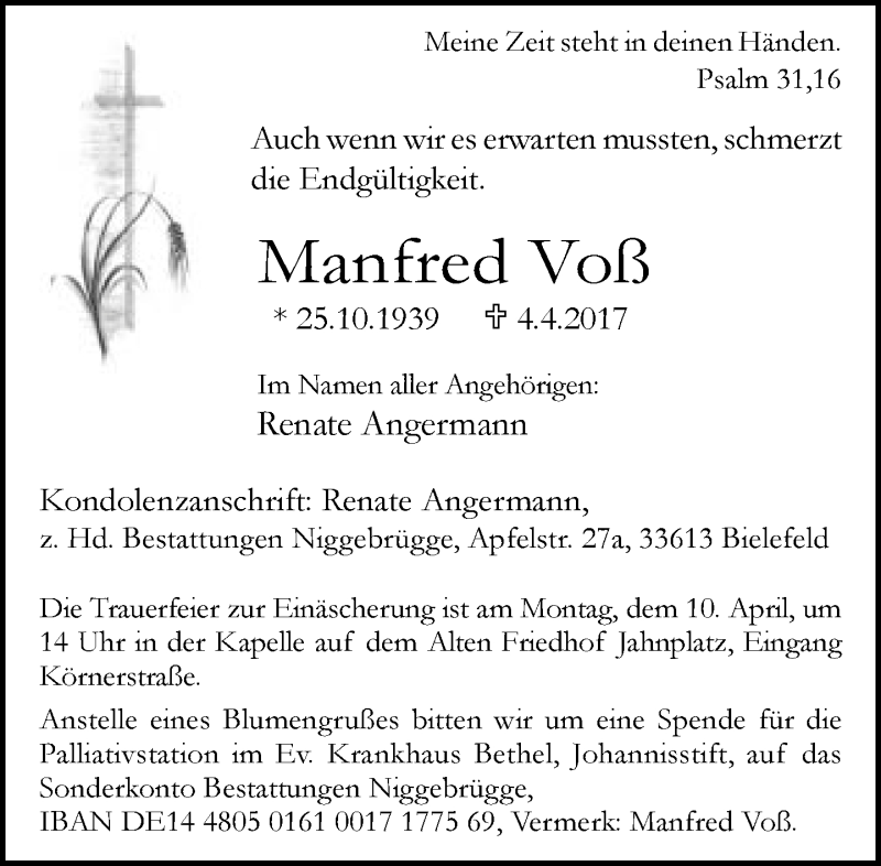 Hier finden Sie alle Traueranzeigen aus der Zeitung, die bisher für Manfred Voß erschienen sind. Weitere Traueranzeigen, die in der Zeitung erscheinen, werden hier ebenfalls aufgelistet