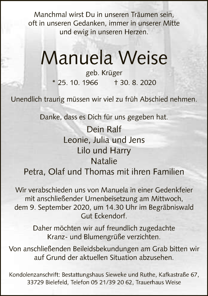 Hier finden Sie alle Traueranzeigen aus der Zeitung, die bisher für Manuela Weise erschienen sind. Weitere Traueranzeigen, die in der Zeitung erscheinen, werden hier ebenfalls aufgelistet