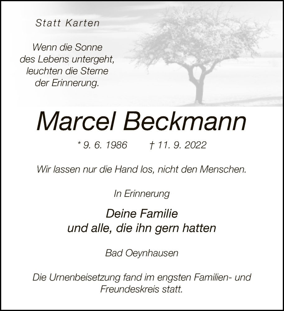 Hier finden Sie alle Traueranzeigen aus der Zeitung, die bisher für Marcel Beckmann erschienen sind. Weitere Traueranzeigen, die in der Zeitung erscheinen, werden hier ebenfalls aufgelistet