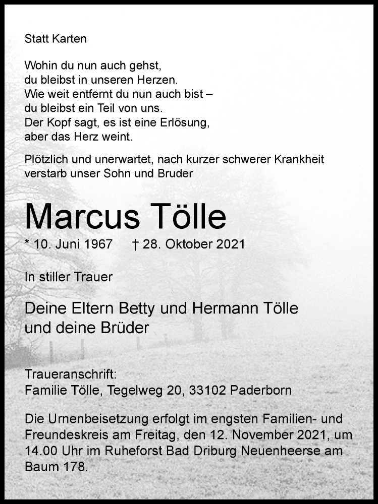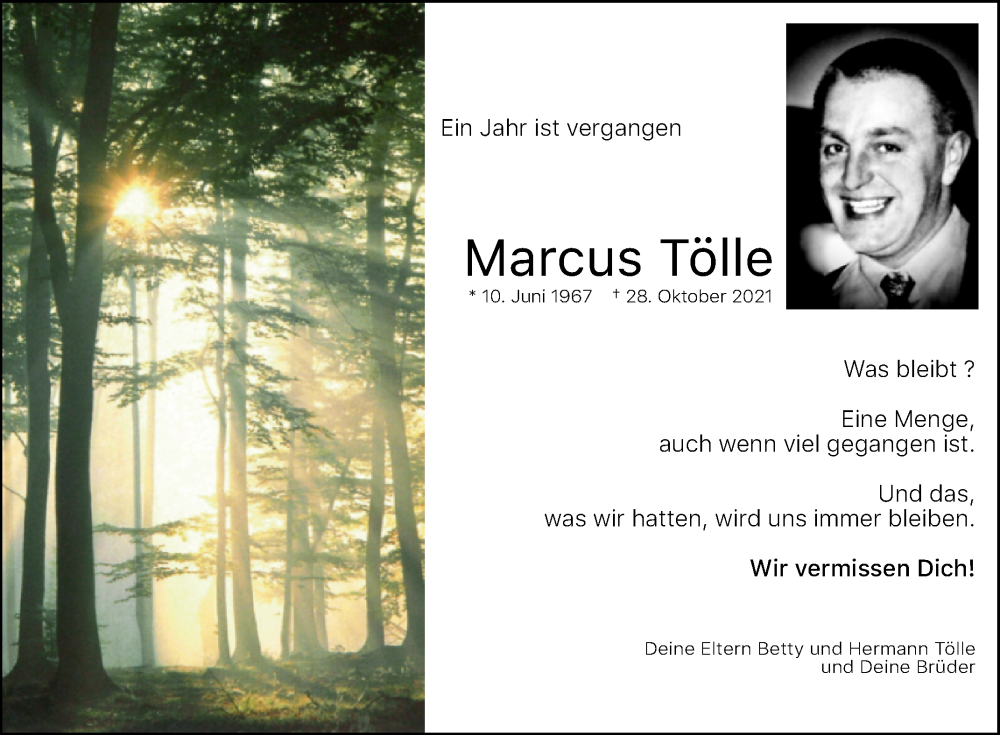 Hier finden Sie alle Traueranzeigen aus der Zeitung, die bisher für Marcus Tölle erschienen sind. Weitere Traueranzeigen, die in der Zeitung erscheinen, werden hier ebenfalls aufgelistet
