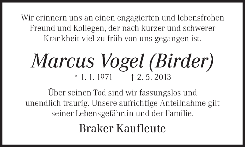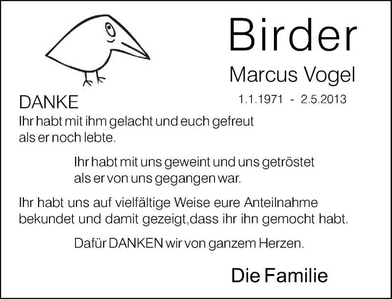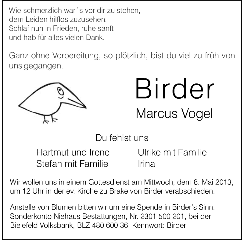 Hier finden Sie alle Traueranzeigen aus der Zeitung, die bisher für Marcus Vogel erschienen sind. Weitere Traueranzeigen, die in der Zeitung erscheinen, werden hier ebenfalls aufgelistet