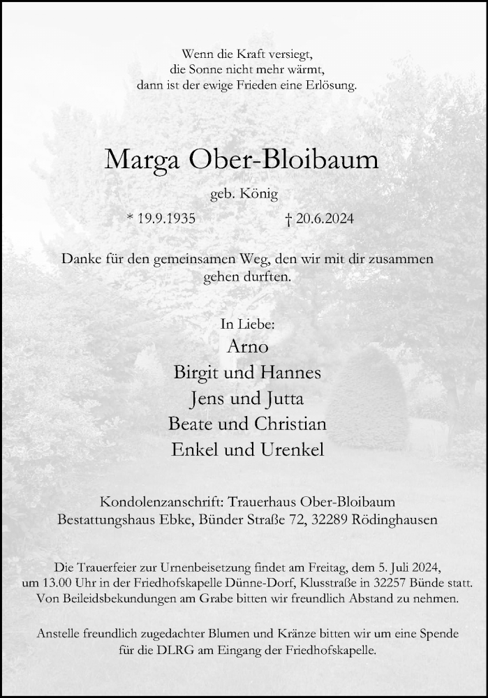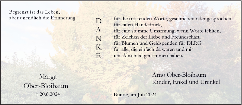Hier finden Sie alle Traueranzeigen aus der Zeitung, die bisher für Marga Ober-Bloibaum erschienen sind. Weitere Traueranzeigen, die in der Zeitung erscheinen, werden hier ebenfalls aufgelistet