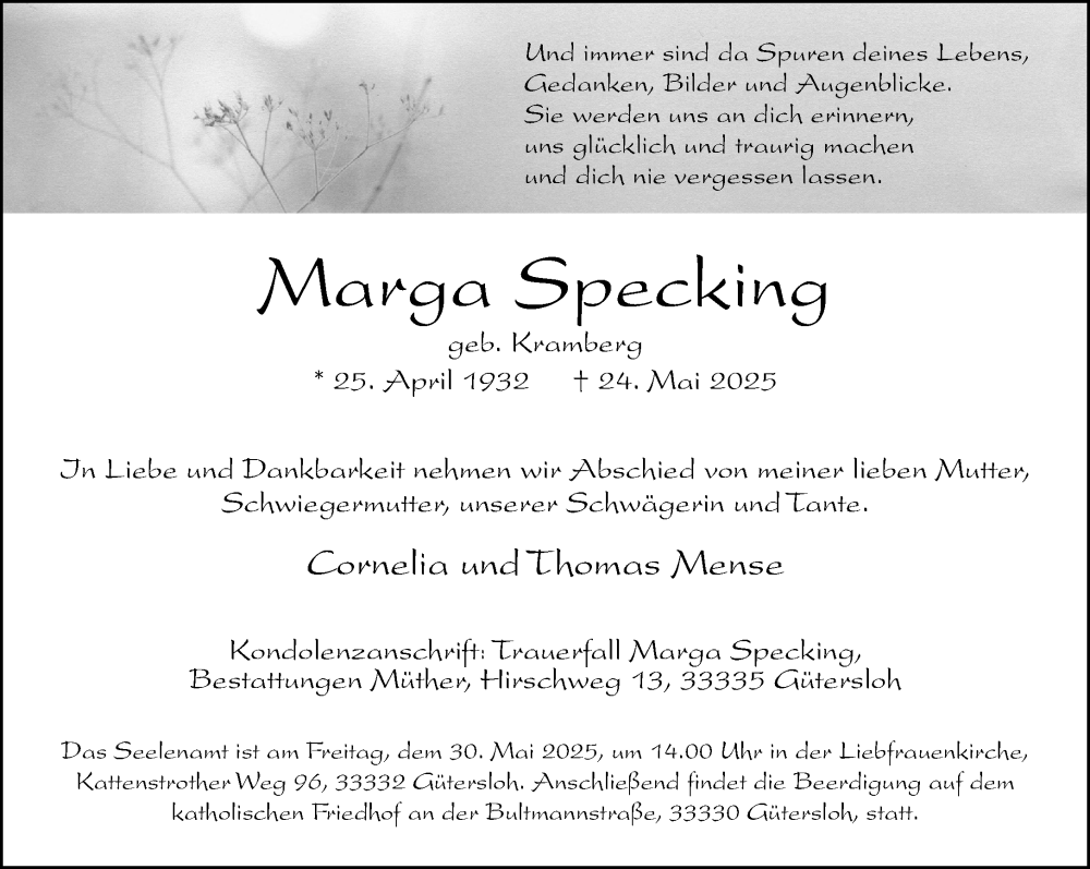Hier finden Sie alle Traueranzeigen aus der Zeitung, die bisher für Marga Specking erschienen sind. Weitere Traueranzeigen, die in der Zeitung erscheinen, werden hier ebenfalls aufgelistet