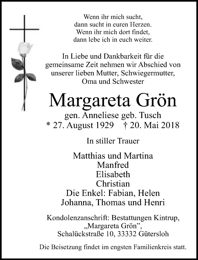 Hier finden Sie alle Traueranzeigen aus der Zeitung, die bisher für Margareta Grön erschienen sind. Weitere Traueranzeigen, die in der Zeitung erscheinen, werden hier ebenfalls aufgelistet