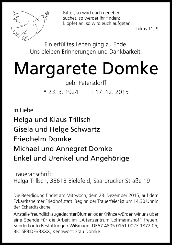 Hier finden Sie alle Traueranzeigen aus der Zeitung, die bisher für Margarete Domke erschienen sind. Weitere Traueranzeigen, die in der Zeitung erscheinen, werden hier ebenfalls aufgelistet