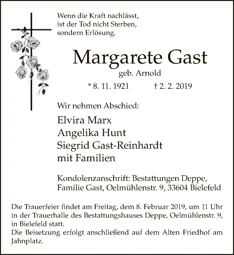 Hier finden Sie alle Traueranzeigen aus der Zeitung, die bisher für Margarete Gast erschienen sind. Weitere Traueranzeigen, die in der Zeitung erscheinen, werden hier ebenfalls aufgelistet