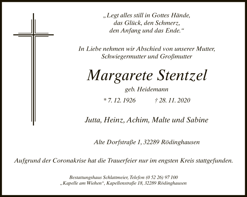 Hier finden Sie alle Traueranzeigen aus der Zeitung, die bisher für Margarete Stentzel erschienen sind. Weitere Traueranzeigen, die in der Zeitung erscheinen, werden hier ebenfalls aufgelistet