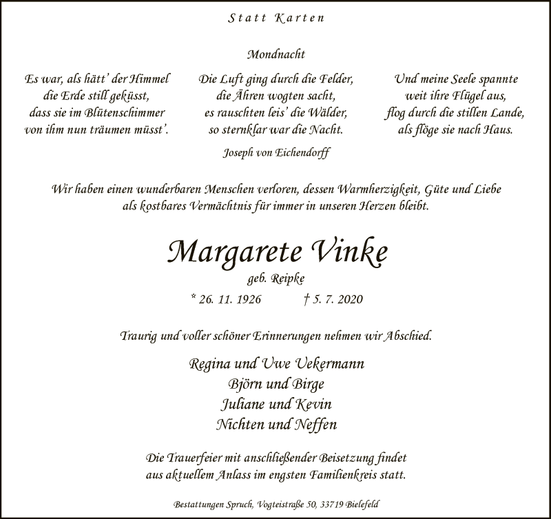 Hier finden Sie alle Traueranzeigen aus der Zeitung, die bisher für Margarete Vinke erschienen sind. Weitere Traueranzeigen, die in der Zeitung erscheinen, werden hier ebenfalls aufgelistet