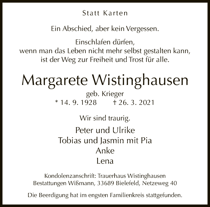Hier finden Sie alle Traueranzeigen aus der Zeitung, die bisher für Margarete Wistinghausen erschienen sind. Weitere Traueranzeigen, die in der Zeitung erscheinen, werden hier ebenfalls aufgelistet