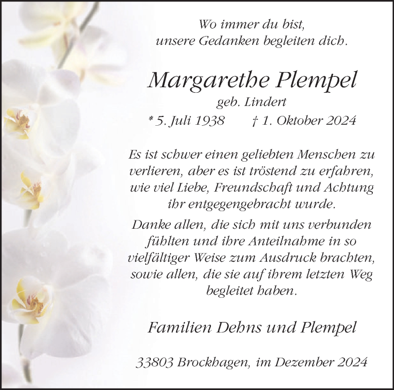Hier finden Sie alle Traueranzeigen aus der Zeitung, die bisher für Margarethe Plempel erschienen sind. Weitere Traueranzeigen, die in der Zeitung erscheinen, werden hier ebenfalls aufgelistet