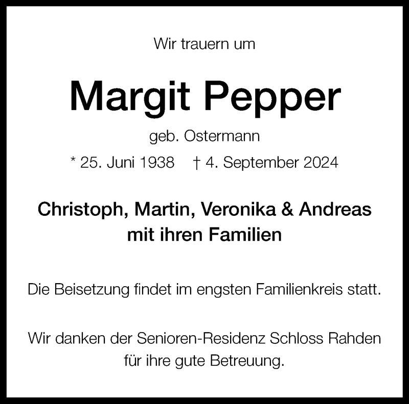 Hier finden Sie alle Traueranzeigen aus der Zeitung, die bisher für Margit Pepper erschienen sind. Weitere Traueranzeigen, die in der Zeitung erscheinen, werden hier ebenfalls aufgelistet