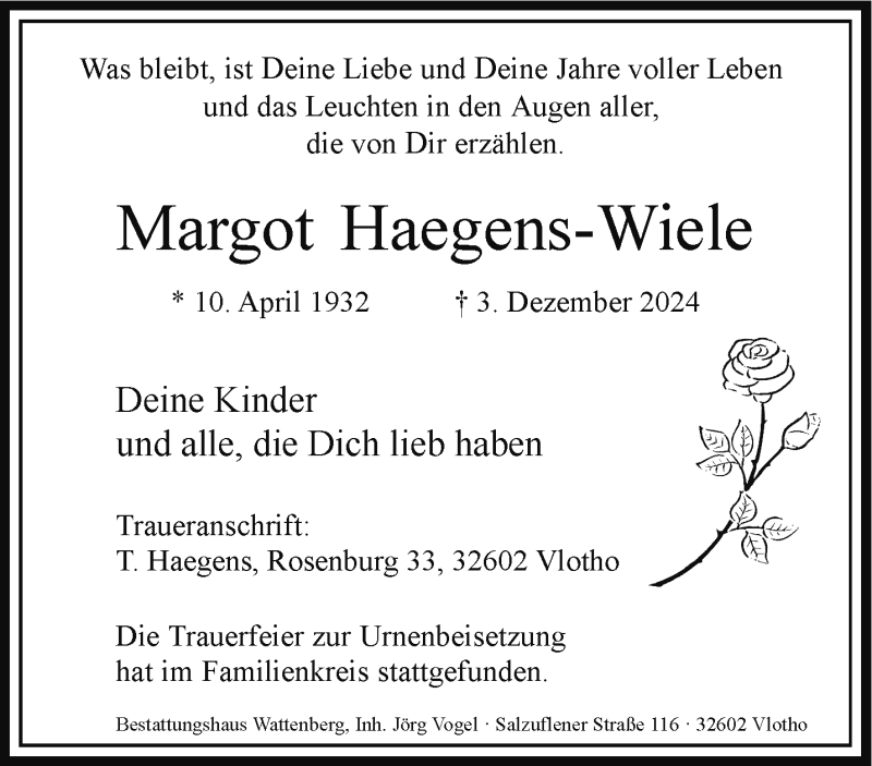Hier finden Sie alle Traueranzeigen aus der Zeitung, die bisher für Margot Haegens-Wiele erschienen sind. Weitere Traueranzeigen, die in der Zeitung erscheinen, werden hier ebenfalls aufgelistet