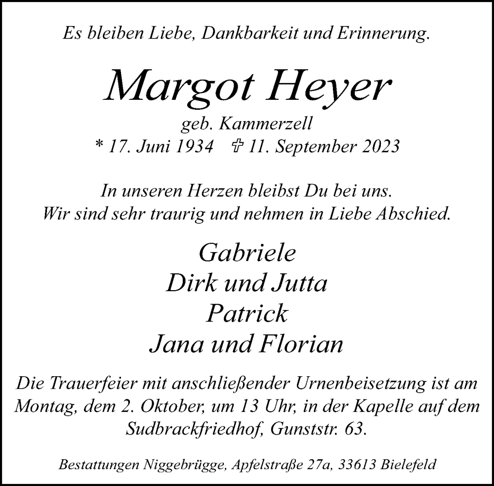 Hier finden Sie alle Traueranzeigen aus der Zeitung, die bisher für Margot Heyer erschienen sind. Weitere Traueranzeigen, die in der Zeitung erscheinen, werden hier ebenfalls aufgelistet
