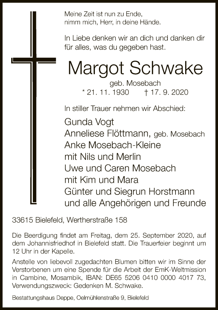 Hier finden Sie alle Traueranzeigen aus der Zeitung, die bisher für Margot Schwake erschienen sind. Weitere Traueranzeigen, die in der Zeitung erscheinen, werden hier ebenfalls aufgelistet