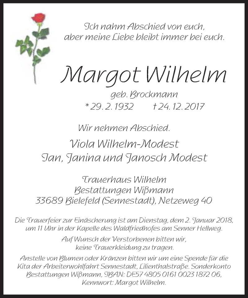 Hier finden Sie alle Traueranzeigen aus der Zeitung, die bisher für Margot Wilhelm erschienen sind. Weitere Traueranzeigen, die in der Zeitung erscheinen, werden hier ebenfalls aufgelistet
