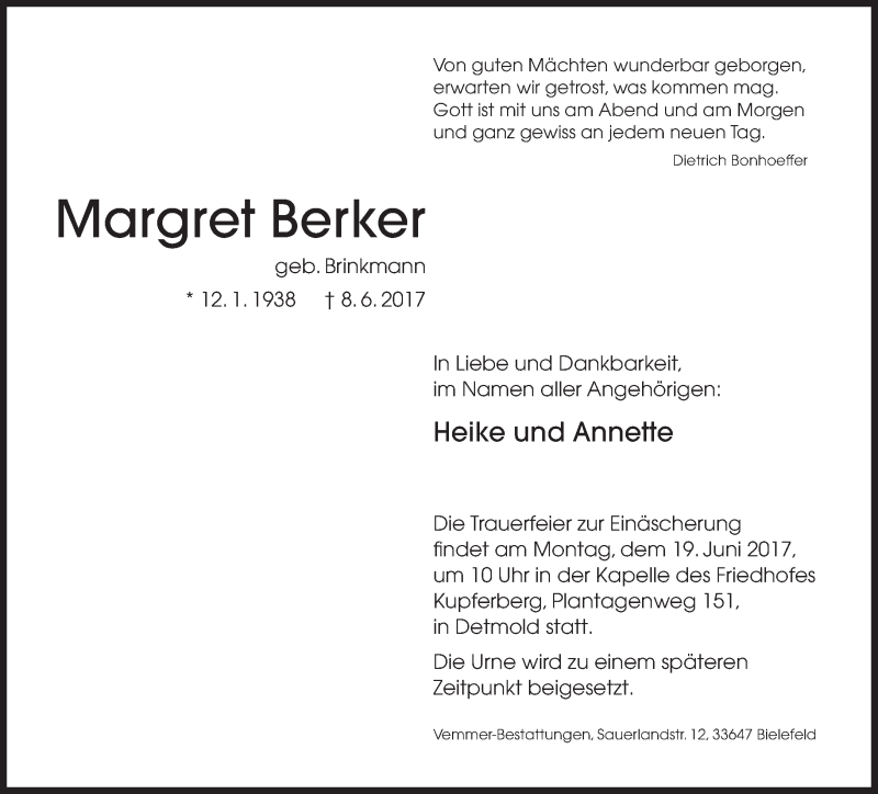 Hier finden Sie alle Traueranzeigen aus der Zeitung, die bisher für Margret Berker erschienen sind. Weitere Traueranzeigen, die in der Zeitung erscheinen, werden hier ebenfalls aufgelistet