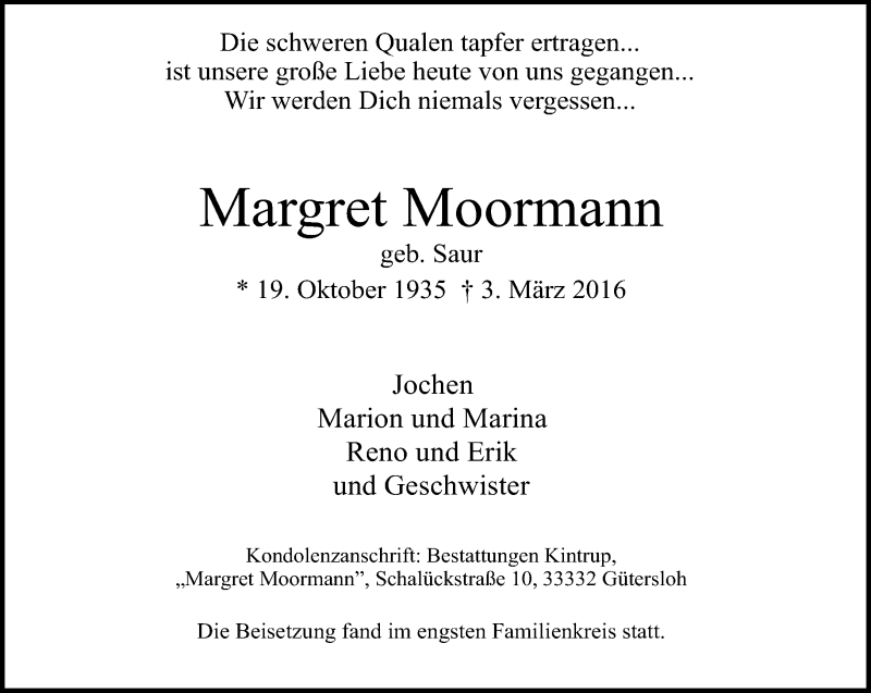 Hier finden Sie alle Traueranzeigen aus der Zeitung, die bisher für Margret Moormann erschienen sind. Weitere Traueranzeigen, die in der Zeitung erscheinen, werden hier ebenfalls aufgelistet