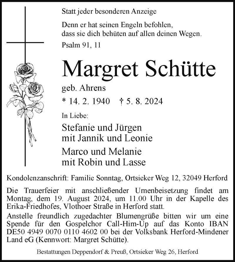 Hier finden Sie alle Traueranzeigen aus der Zeitung, die bisher für Margret Schütte erschienen sind. Weitere Traueranzeigen, die in der Zeitung erscheinen, werden hier ebenfalls aufgelistet
