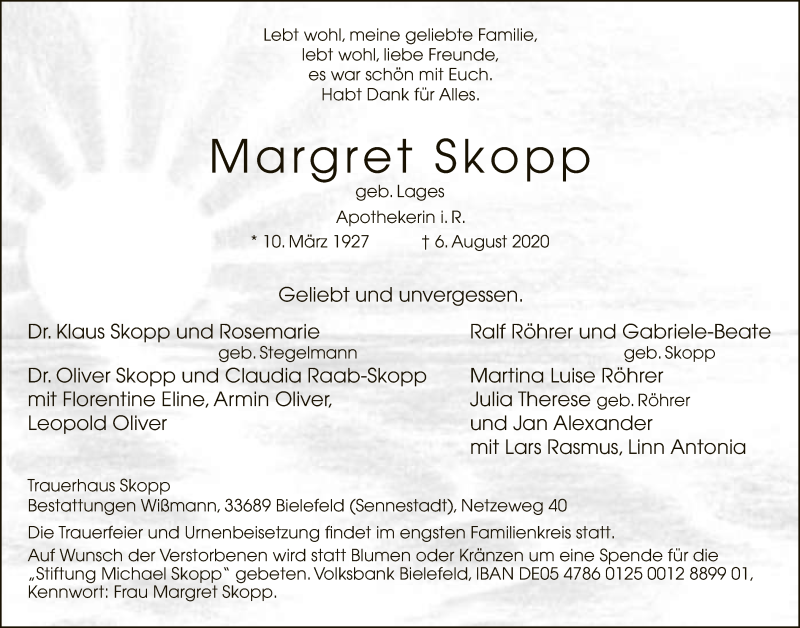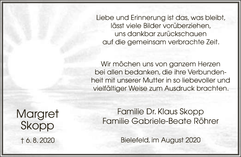 Hier finden Sie alle Traueranzeigen aus der Zeitung, die bisher für Margret Skopp erschienen sind. Weitere Traueranzeigen, die in der Zeitung erscheinen, werden hier ebenfalls aufgelistet