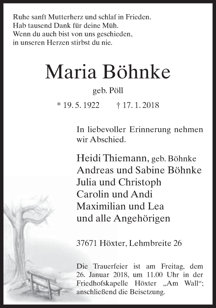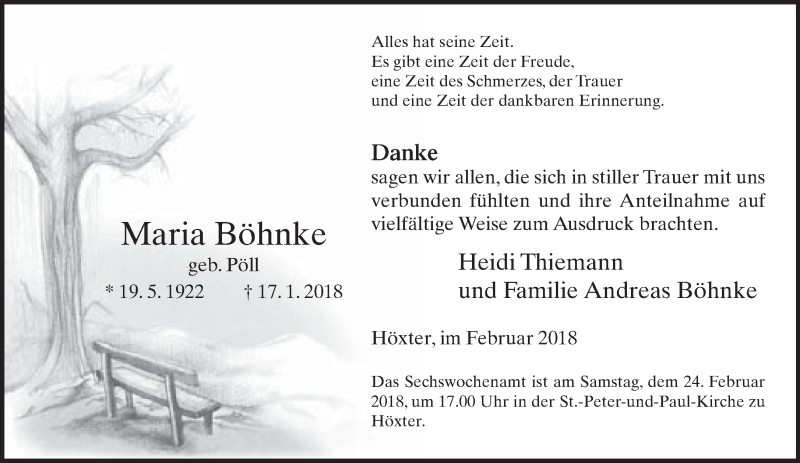 Hier finden Sie alle Traueranzeigen aus der Zeitung, die bisher für Maria Böhnke erschienen sind. Weitere Traueranzeigen, die in der Zeitung erscheinen, werden hier ebenfalls aufgelistet