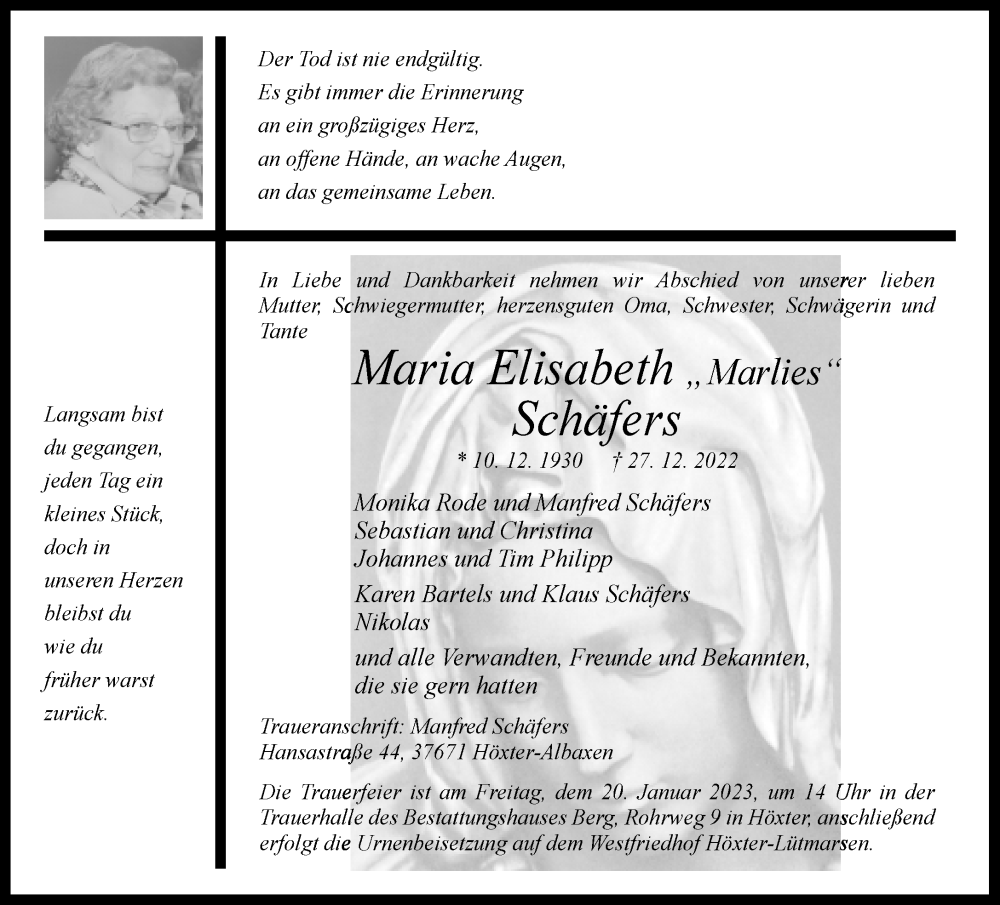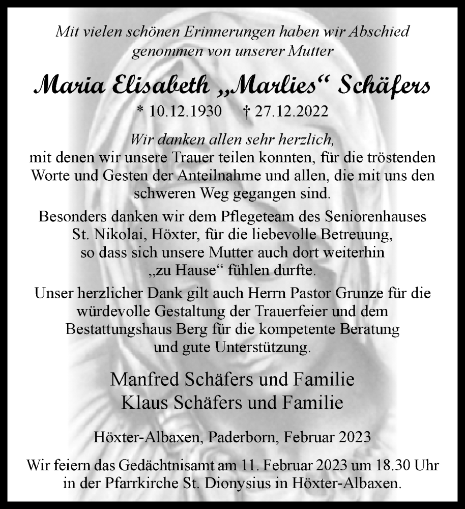 Hier finden Sie alle Traueranzeigen aus der Zeitung, die bisher für Maria Elisabeth Schäfers erschienen sind. Weitere Traueranzeigen, die in der Zeitung erscheinen, werden hier ebenfalls aufgelistet
