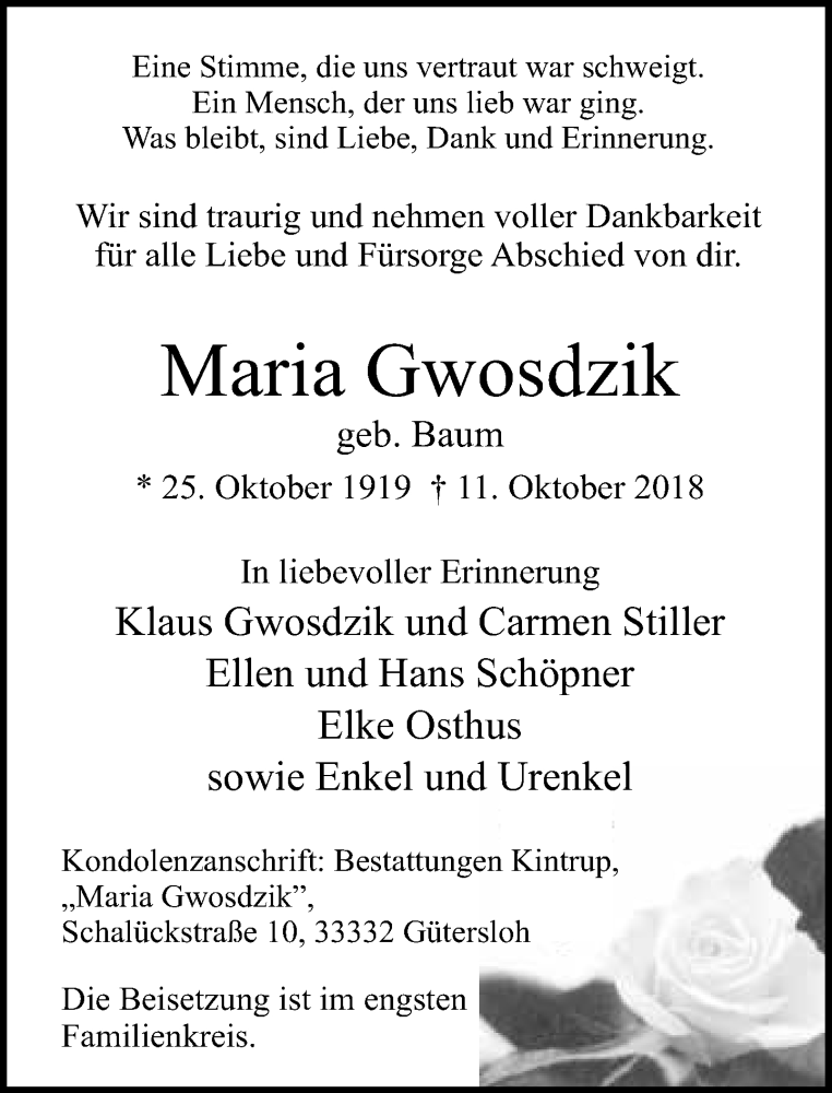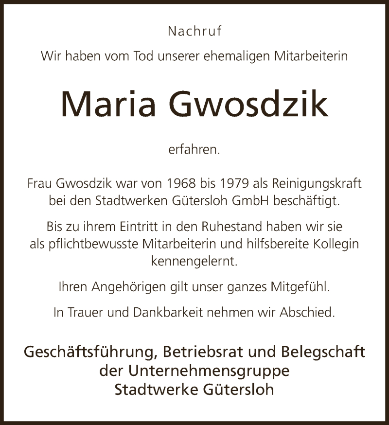 Hier finden Sie alle Traueranzeigen aus der Zeitung, die bisher für Maria Gwosdzik erschienen sind. Weitere Traueranzeigen, die in der Zeitung erscheinen, werden hier ebenfalls aufgelistet