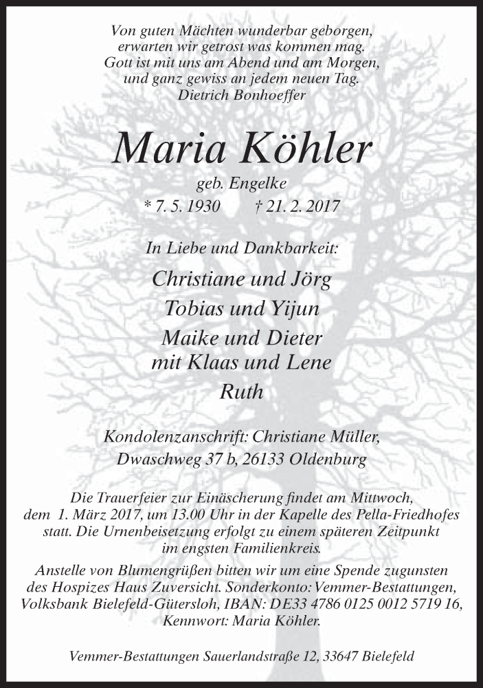 Hier finden Sie alle Traueranzeigen aus der Zeitung, die bisher für Maria Köhler erschienen sind. Weitere Traueranzeigen, die in der Zeitung erscheinen, werden hier ebenfalls aufgelistet