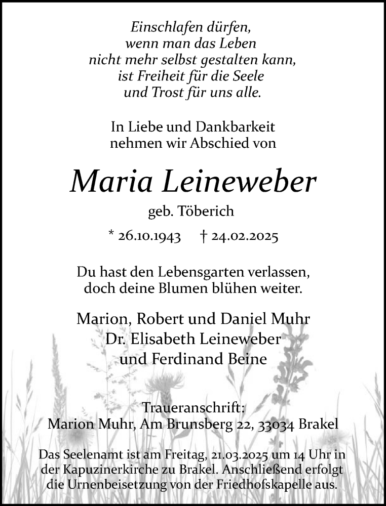 Hier finden Sie alle Traueranzeigen aus der Zeitung, die bisher für Maria Leineweber erschienen sind. Weitere Traueranzeigen, die in der Zeitung erscheinen, werden hier ebenfalls aufgelistet
