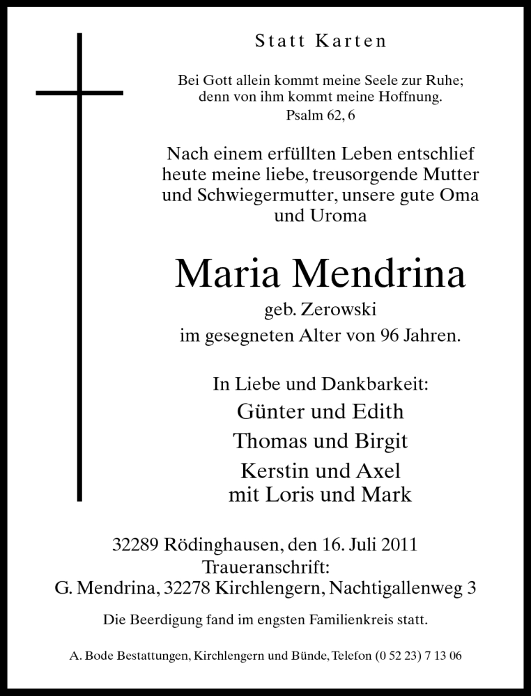 Hier finden Sie alle Traueranzeigen aus der Zeitung, die bisher für Maria Mendrina erschienen sind. Weitere Traueranzeigen, die in der Zeitung erscheinen, werden hier ebenfalls aufgelistet