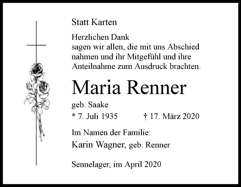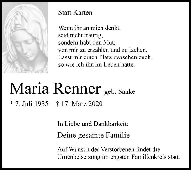 Hier finden Sie alle Traueranzeigen aus der Zeitung, die bisher für Maria Renner erschienen sind. Weitere Traueranzeigen, die in der Zeitung erscheinen, werden hier ebenfalls aufgelistet