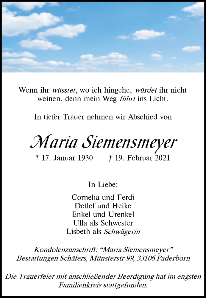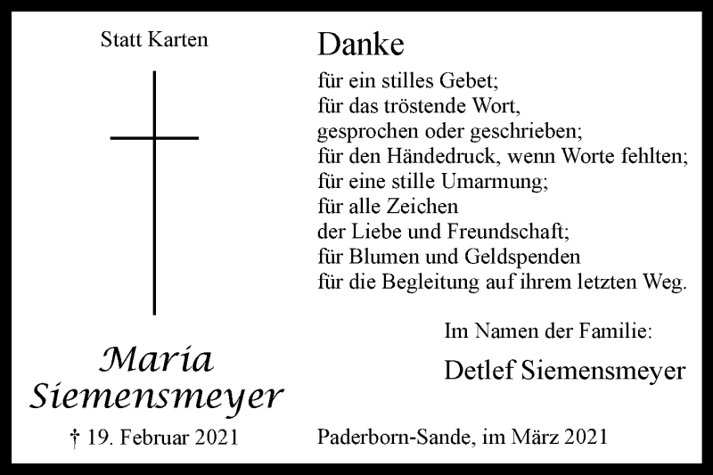 Hier finden Sie alle Traueranzeigen aus der Zeitung, die bisher für Maria Siemensmeyer erschienen sind. Weitere Traueranzeigen, die in der Zeitung erscheinen, werden hier ebenfalls aufgelistet