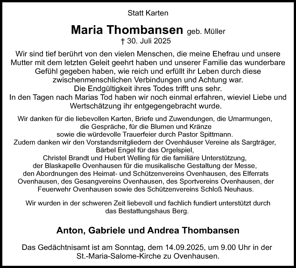Hier finden Sie alle Traueranzeigen aus der Zeitung, die bisher für Maria Thombansen erschienen sind. Weitere Traueranzeigen, die in der Zeitung erscheinen, werden hier ebenfalls aufgelistet
