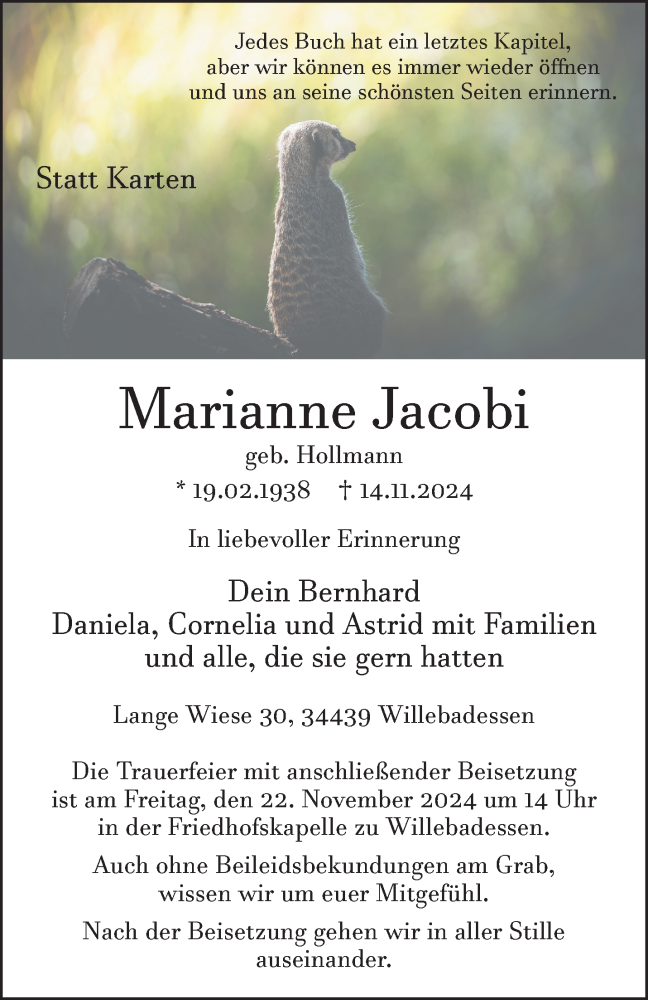 Hier finden Sie alle Traueranzeigen aus der Zeitung, die bisher für Marianne Jacobi erschienen sind. Weitere Traueranzeigen, die in der Zeitung erscheinen, werden hier ebenfalls aufgelistet