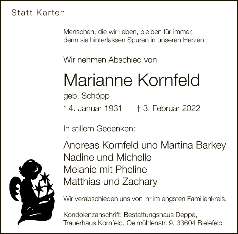 Hier finden Sie alle Traueranzeigen aus der Zeitung, die bisher für Marianne Kornfeld erschienen sind. Weitere Traueranzeigen, die in der Zeitung erscheinen, werden hier ebenfalls aufgelistet