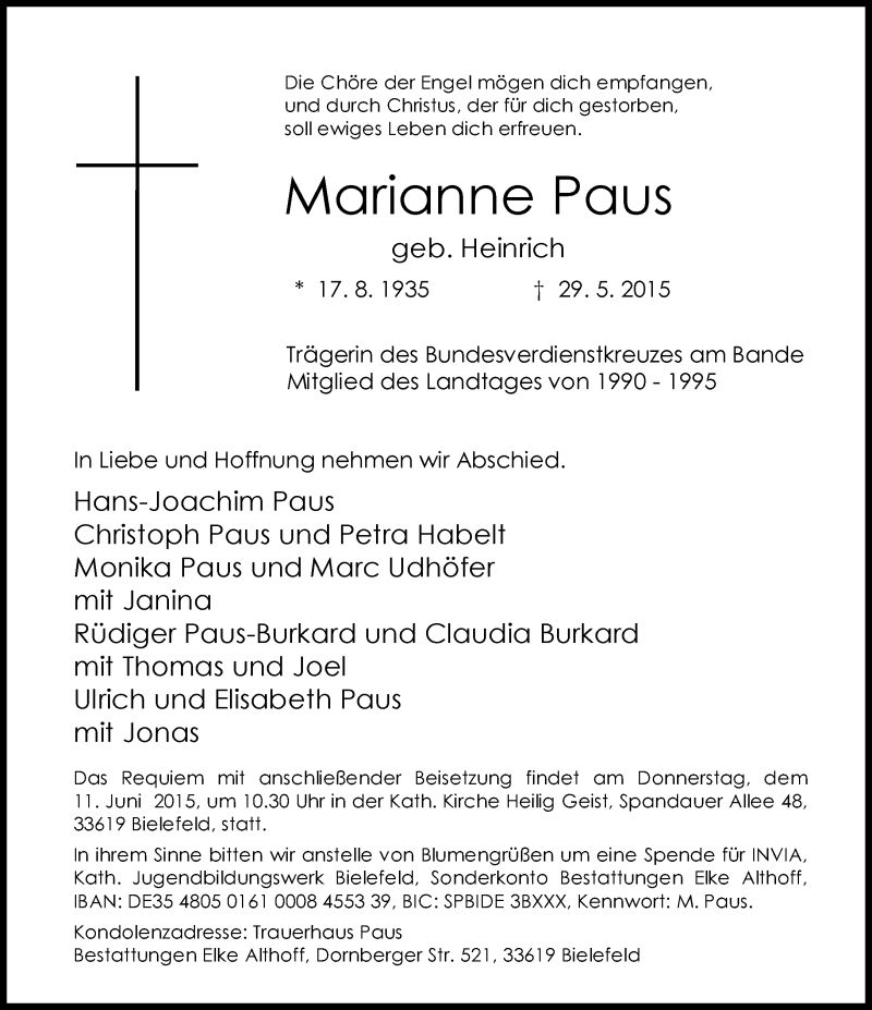 Hier finden Sie alle Traueranzeigen aus der Zeitung, die bisher für Marianne Paus erschienen sind. Weitere Traueranzeigen, die in der Zeitung erscheinen, werden hier ebenfalls aufgelistet