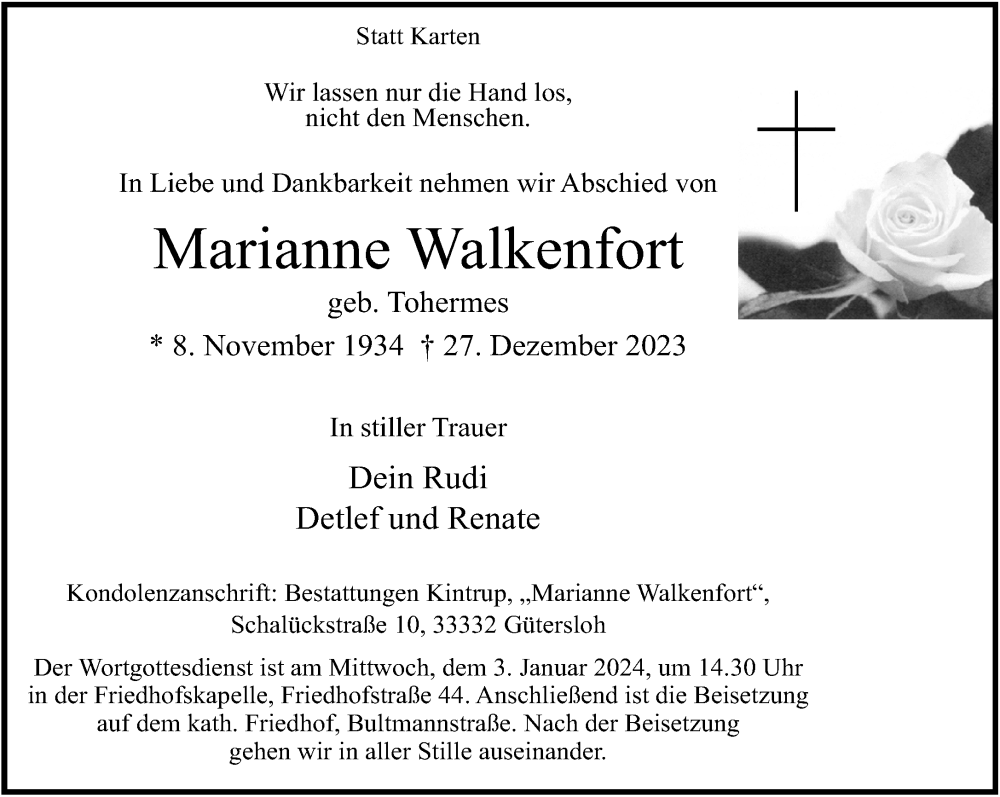Hier finden Sie alle Traueranzeigen aus der Zeitung, die bisher für Marianne Walkenfort erschienen sind. Weitere Traueranzeigen, die in der Zeitung erscheinen, werden hier ebenfalls aufgelistet