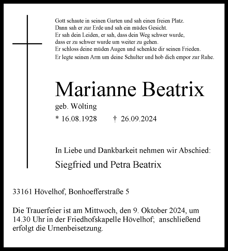 Hier finden Sie alle Traueranzeigen aus der Zeitung, die bisher für Marianne Beatrix Beatrix erschienen sind. Weitere Traueranzeigen, die in der Zeitung erscheinen, werden hier ebenfalls aufgelistet
