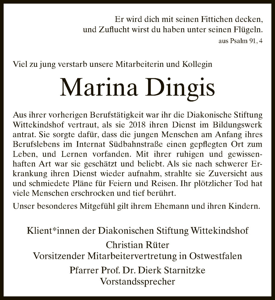 Hier finden Sie alle Traueranzeigen aus der Zeitung, die bisher für Marina Dingis erschienen sind. Weitere Traueranzeigen, die in der Zeitung erscheinen, werden hier ebenfalls aufgelistet