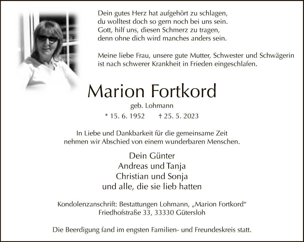 Hier finden Sie alle Traueranzeigen aus der Zeitung, die bisher für Marion Fortkord erschienen sind. Weitere Traueranzeigen, die in der Zeitung erscheinen, werden hier ebenfalls aufgelistet