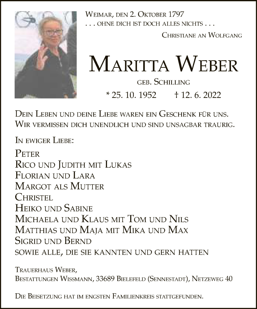 Hier finden Sie alle Traueranzeigen aus der Zeitung, die bisher für Maritta Weber erschienen sind. Weitere Traueranzeigen, die in der Zeitung erscheinen, werden hier ebenfalls aufgelistet