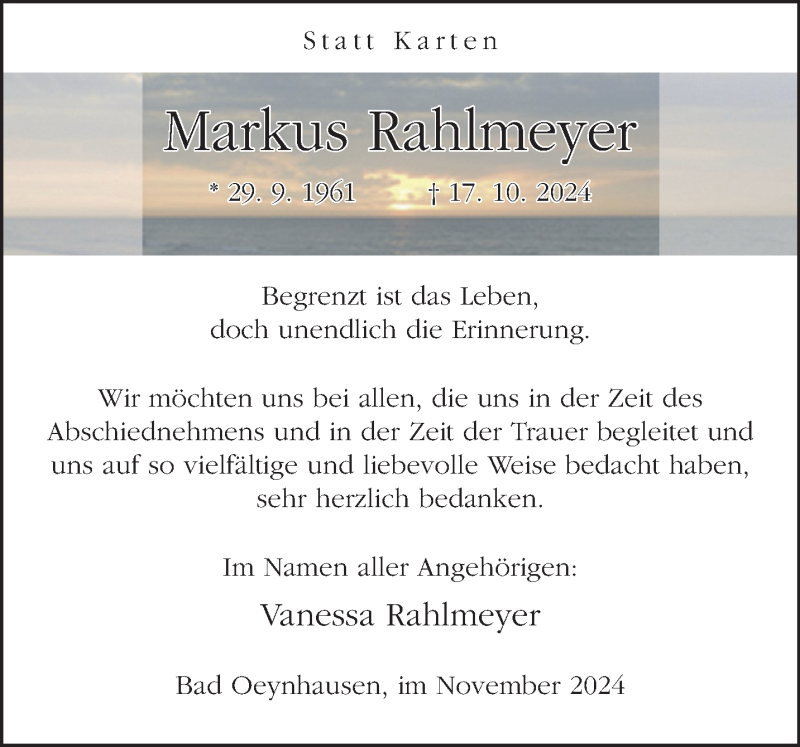 Hier finden Sie alle Traueranzeigen aus der Zeitung, die bisher für Markus Rahlmeyer erschienen sind. Weitere Traueranzeigen, die in der Zeitung erscheinen, werden hier ebenfalls aufgelistet