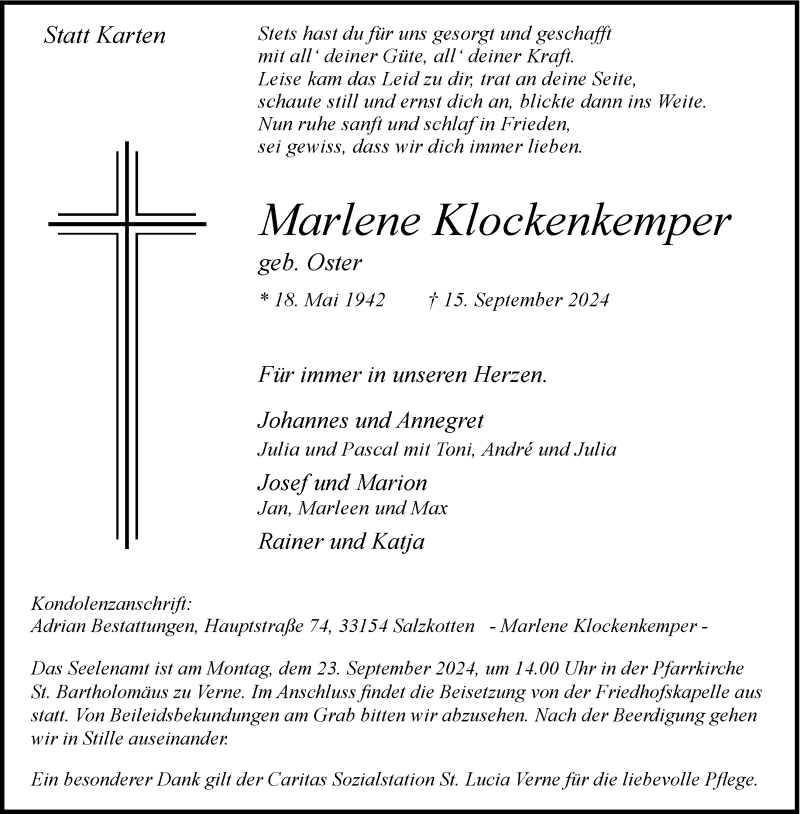 Hier finden Sie alle Traueranzeigen aus der Zeitung, die bisher für Marlene Klockenkemper erschienen sind. Weitere Traueranzeigen, die in der Zeitung erscheinen, werden hier ebenfalls aufgelistet
