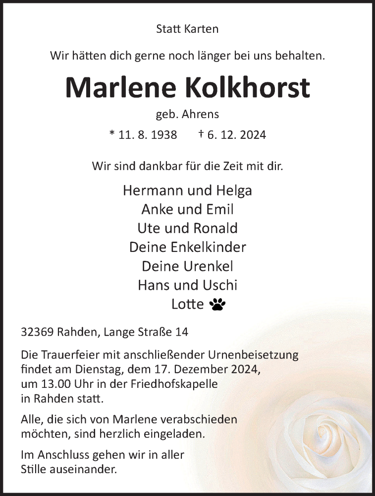 Hier finden Sie alle Traueranzeigen aus der Zeitung, die bisher für Marlene Kolkhorst erschienen sind. Weitere Traueranzeigen, die in der Zeitung erscheinen, werden hier ebenfalls aufgelistet