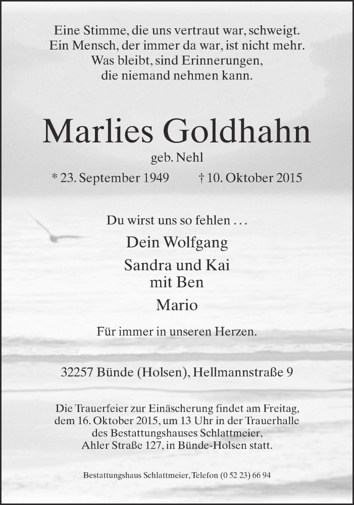 Hier finden Sie alle Traueranzeigen aus der Zeitung, die bisher für Marlies Goldhahn erschienen sind. Weitere Traueranzeigen, die in der Zeitung erscheinen, werden hier ebenfalls aufgelistet