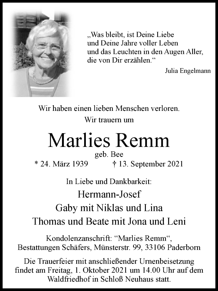Hier finden Sie alle Traueranzeigen aus der Zeitung, die bisher für Marlies Remm erschienen sind. Weitere Traueranzeigen, die in der Zeitung erscheinen, werden hier ebenfalls aufgelistet
