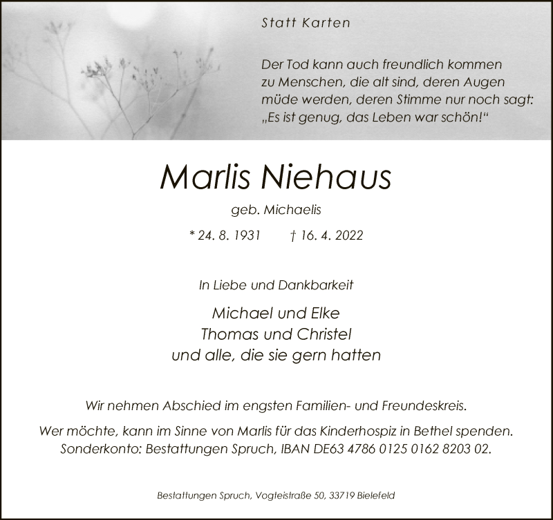 Hier finden Sie alle Traueranzeigen aus der Zeitung, die bisher für Marlis Niehaus erschienen sind. Weitere Traueranzeigen, die in der Zeitung erscheinen, werden hier ebenfalls aufgelistet
